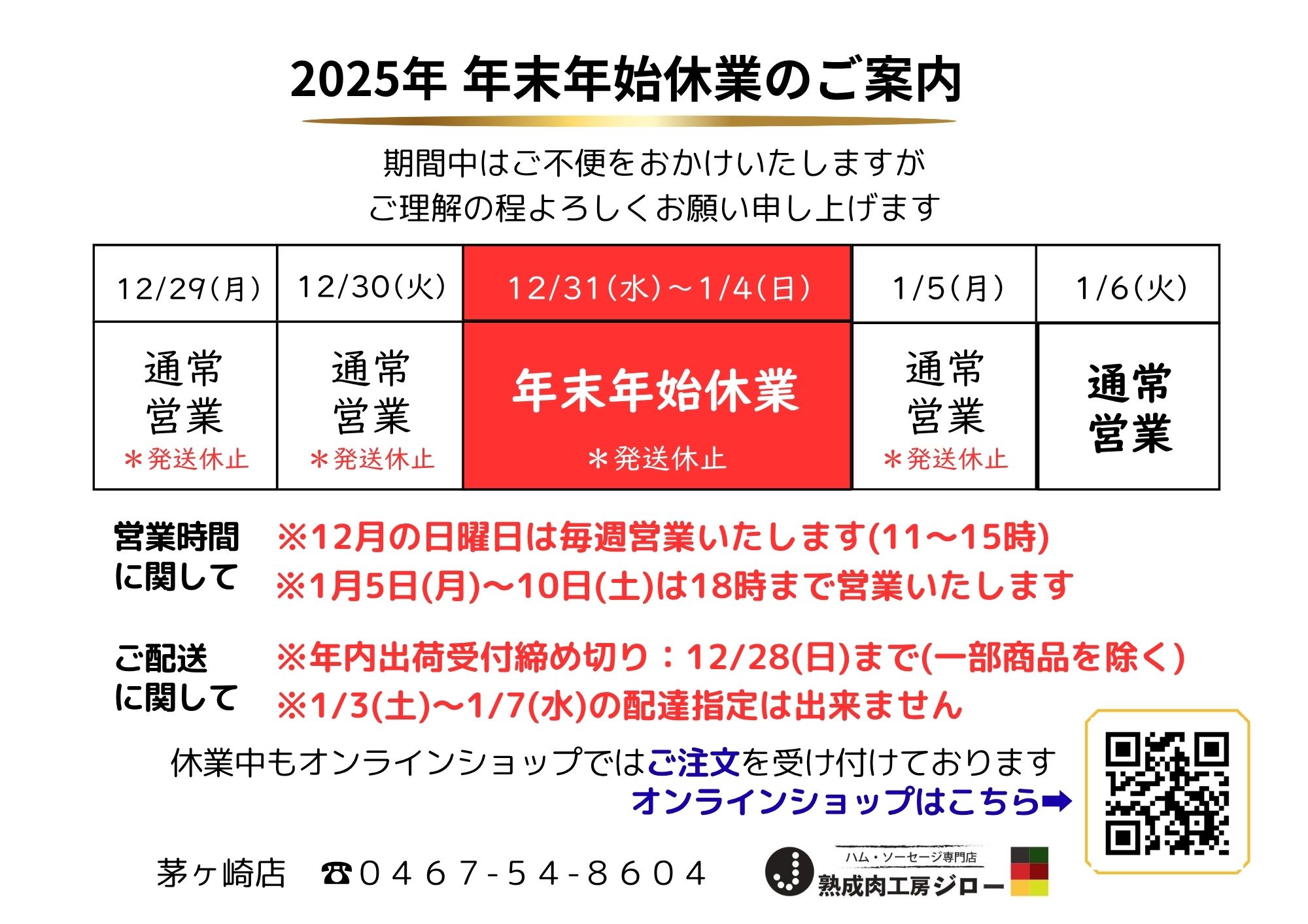 「年末年始休業のお知らせ」休業日:12/31(水)~1/4(日)
